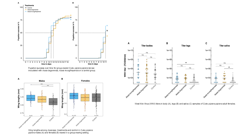 Our results shows that larval exposure to Asaia krungthepensis sped up development and produced larger male Cx. p. pipiens, indicating potential benefits for mass-rearing. In females, Asaia spp. did not change overall West Nile Virus infection outcomes but did affect virus titres, likely through indirect microbiota-related effects.